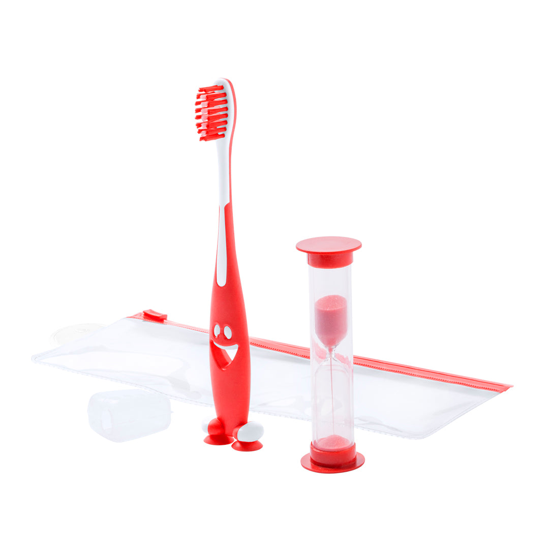 Set Cepillo de dientes y reloj de arena en llamativos colores. Incluye cepillo de divertido diseño y suave tacto con ventosas en la base y reloj de arena de 2 minutos de duración. Presentado en bolsa individual con cierre zip.