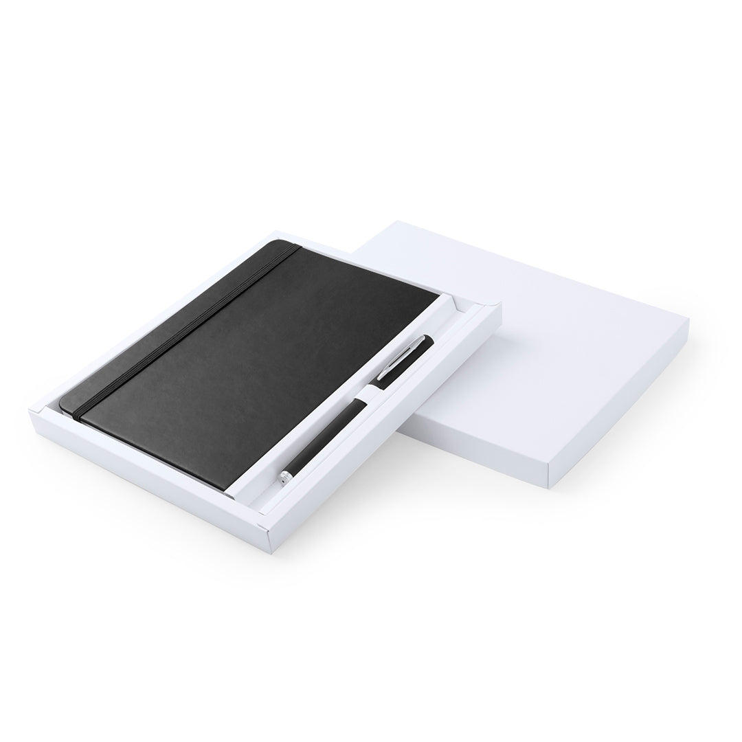 Set de bloc de notas con tapas de suave tacto acabadas en polipiel y bolígrafo de suave cuerpo a juego. De 100 hojas lisas con elástico de sujeción y marcapáginas de tela a juego. Presentado en elegante estuche de cartón blanco troquelado. Bolígrafo en tinta azul.
