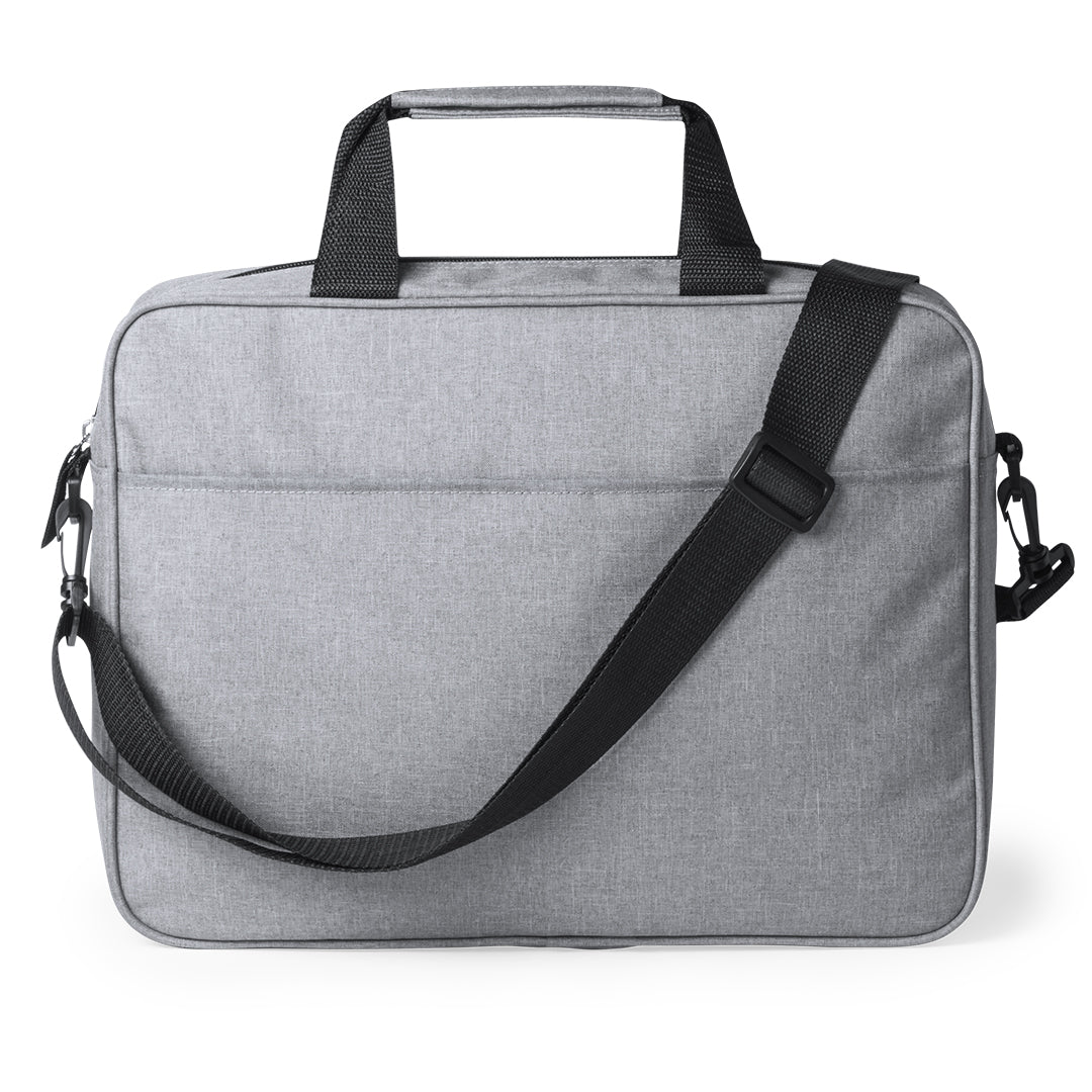 Portadocumentos de cierre de cremallera en elegante poliéster 600D de color gris. Con bolsillo exterior con cierre de velcro, cómodas asas reforzadas, cinta bandolera ajustable con cierre de mosquetón y accesorio en parte trasera para acople en barra de trolley.