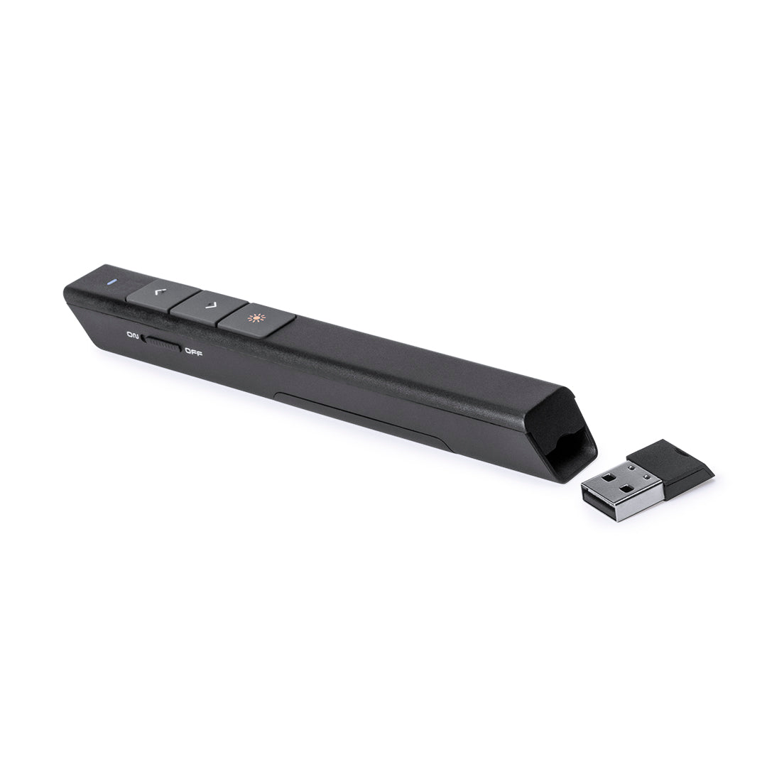 Elegante puntero láser de clase 2 con conexión USB y de suave acabado. Especialmente diseñado para presentaciones PowerPoint y Keynote, incorpora pulsadores de activación laterales, con botones de avance, pausa y retroceso. Con cuerpo especialmente diseñado para marcaje en tampografía. Alimentación a pilas: 1xAAA incluida. Presentado en elegante y resistente estuche de cartón negro, con suave esponja troquelada y compartimento para pila.