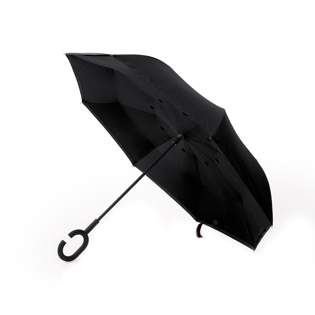 Paraguas reversible de 8 paneles, en resistente material pongee de vivos colores y con original mango manos libres. De 108cm de diámetro, con apertura manual, varillas de fibra y cierre de velcro.