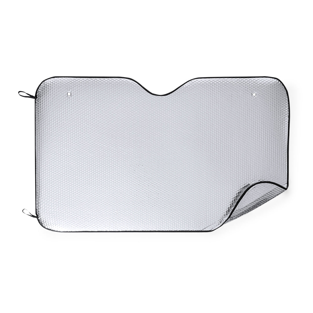 Parasol en aluminio con burbuja en ambas caras en color plateado de acabado metalizado con ribetes en color negro. De tamaño 130x80cm, con argollas metálicas de refuerzo, cintas elásticas para plegado, dos ventosas para ajuste en luna y presentación desplegado en plancha para fácil impresión.