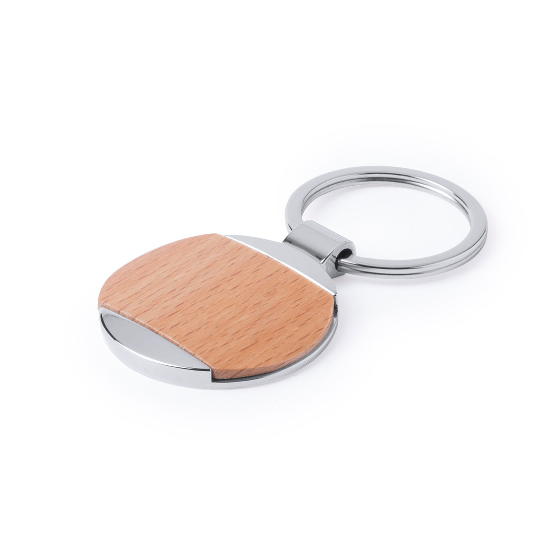 Llavero en combinación de materiales metal de acabado brillante y madera natural. Con amplia superficie para marcaje y presentado en bolsita con refuerzo de cartón en color plateado. Disponible en diseños circular y rectangular.