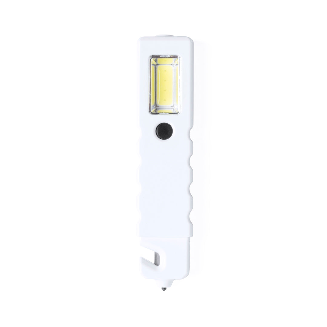 Martillo de emergencia 3 en 1 con linterna led y 4 luces COB con 3 modos de iluminación. Con superficie imantada y cuchilla corta cinturones.