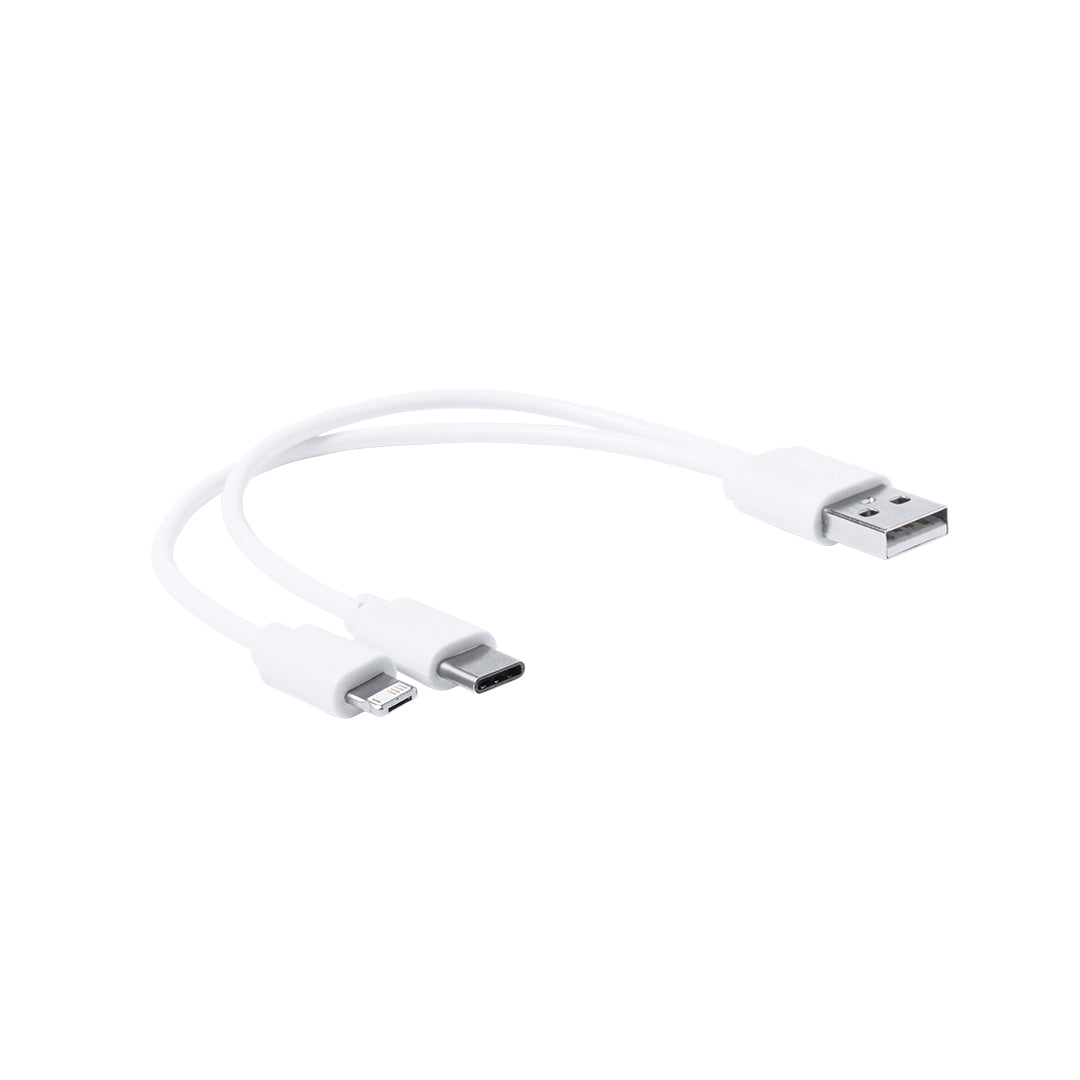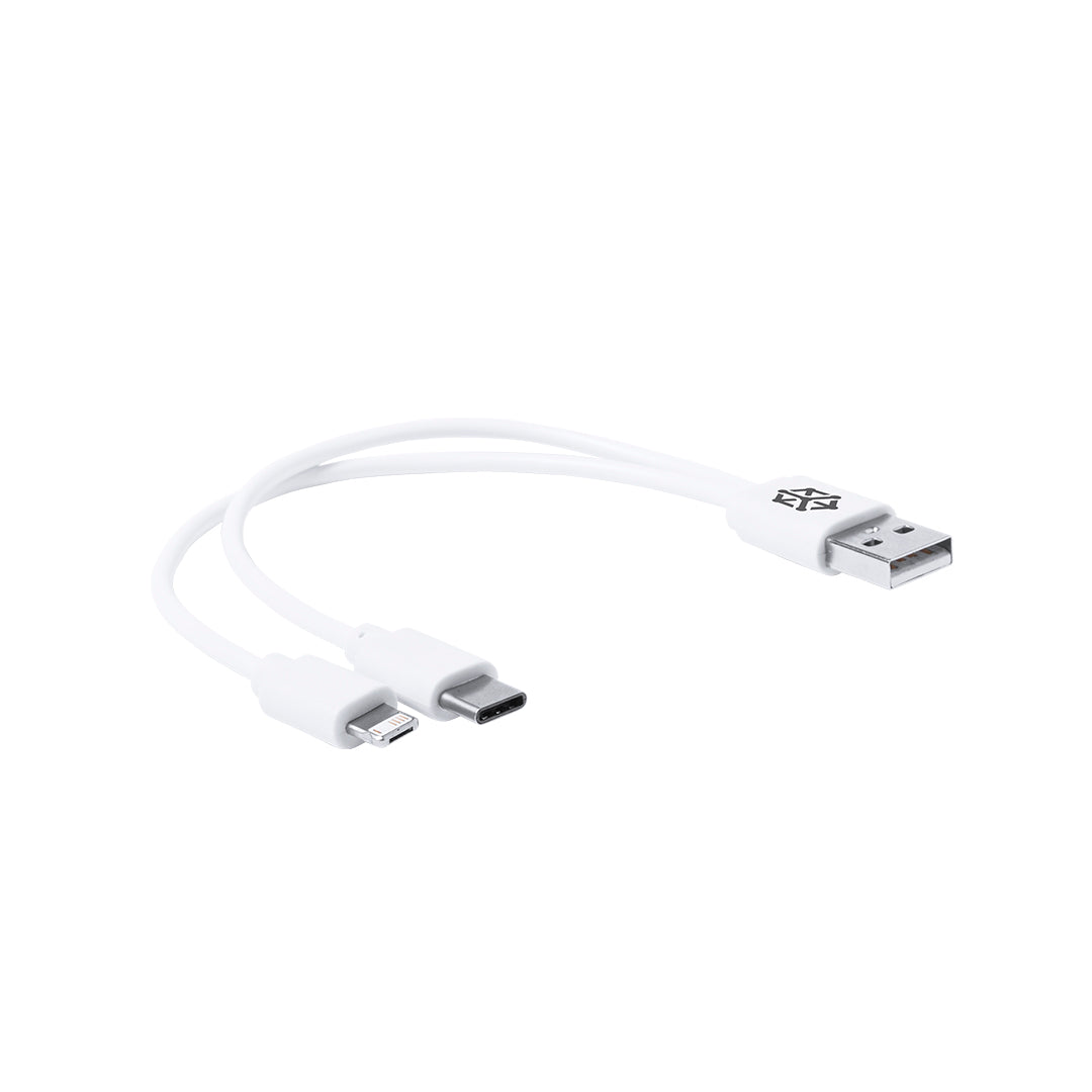 Cable cargador USB con conexiones Tipo-C y dual micro USB/Lightning. En diseñó minimalista de color blanco.