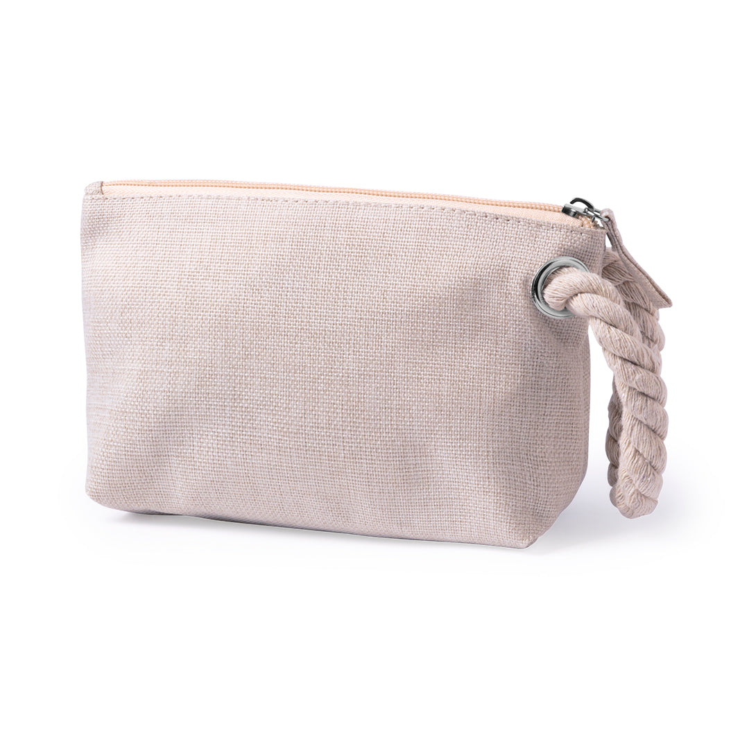 Portatodo multiusos en suave combinación de algodón y poliéster en tonos crudos naturales. Cremallera a juego, con práctica asa trenzada, argolla de refuerzo metálica y suave forro interior en color crudo.