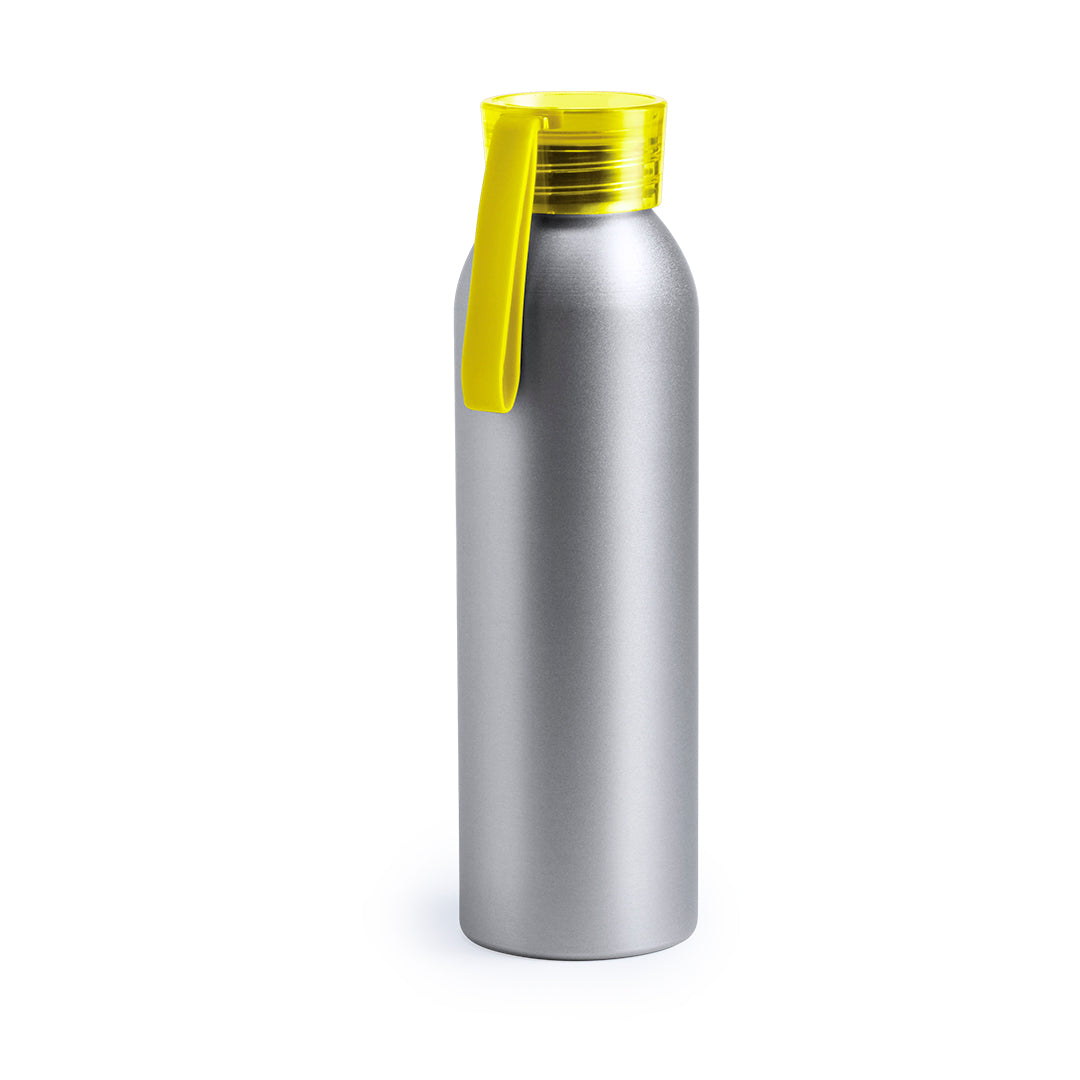 Bidón de aluminio de 650 ml de capacidad. Cuerpo en color plateado, con tapón de seguridad a rosca en variada gama de colores transparentes. Cinta de transporte en material TPR a juego.
