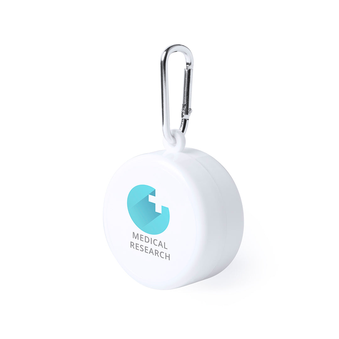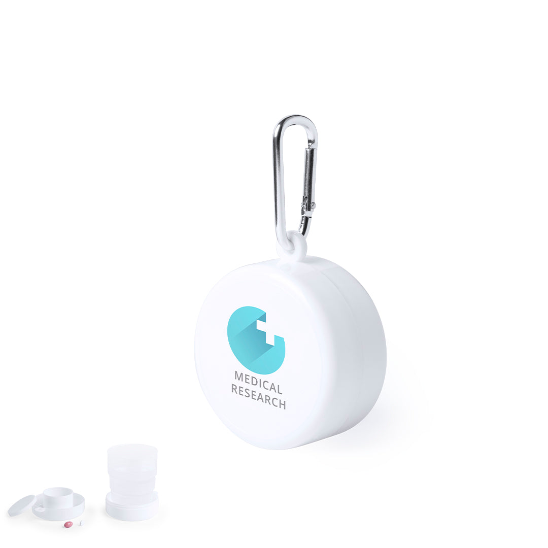 Original vaso plegable para emergencias en elegante color blanco. De 220ml de capacidad y pastillero con tapa integrado en el tapón. Con mosquetón metálico de transporte.