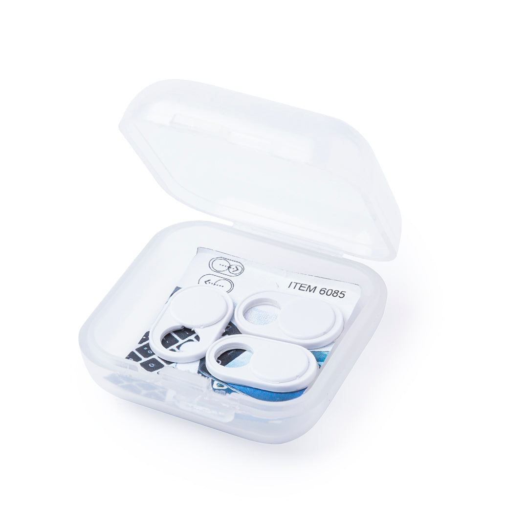 Tapa para cámara de dispositivo móvil para proteger la privacidad. En tamaño ultra compacto y servida en estuche individual de achado translúcido con 3 piezas. Disponible en colores blanco y negro, set presentado en bolsita individual con cartulina de diseño.