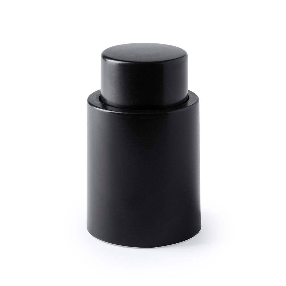 Tapón con bomba de vacío para botellas de vino en elegante diseño de color negro. Parte superior del tapón para marcaje en tampografía. Presentado en caja individual.