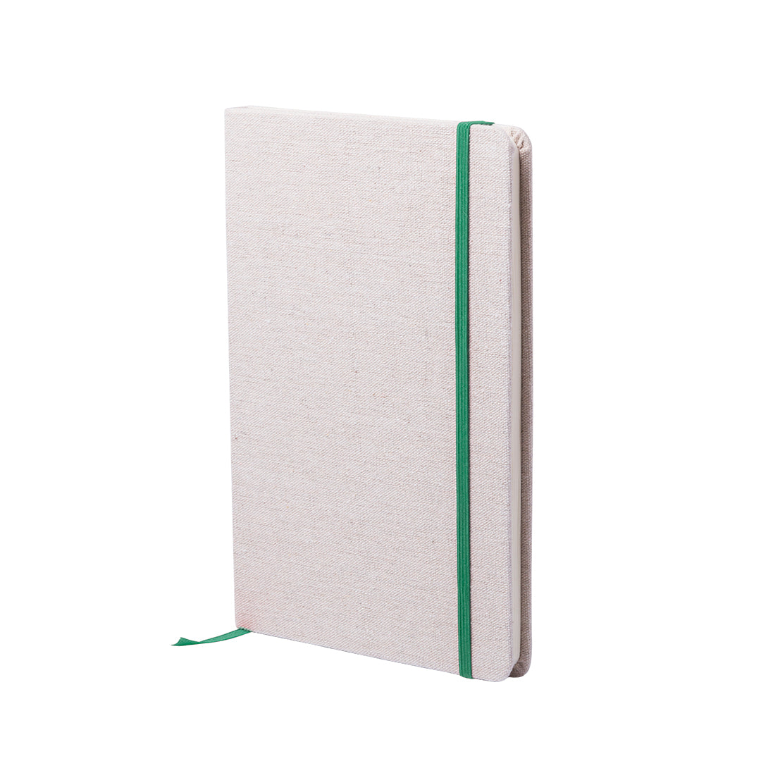 Bloc de notas de materiales naturales. Tapas en suave algodón de color crudo, con elástico de cierre y marcapáginas a juego en vivos colores. Incluye 80 hojas lisas.