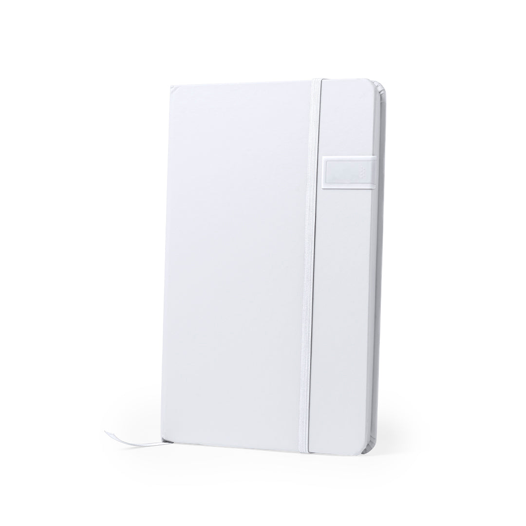 Bloc de notas de elegante acabado en color blanco, con memoria USB de 16GB de capacidad integrada en la tapa frontal. Cinta elástica, memoria USB y marcapáginas a juego, en variada gama de colores. Incluye 100 hojas con disposición a una raya.