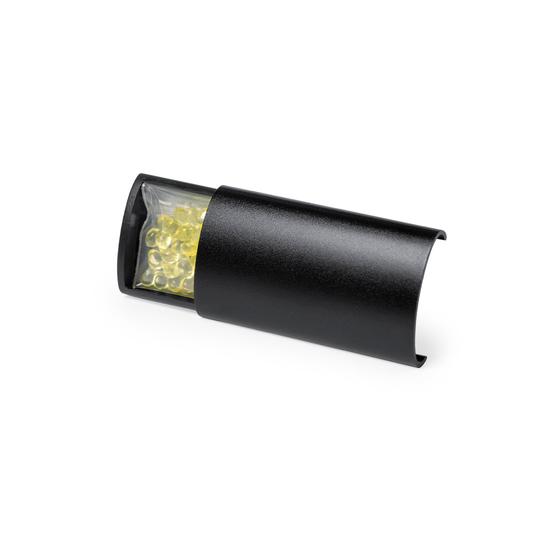 Ambientador para rejilla de coche en elegante diseño. Con frontal deslizante en aluminio granulado y resistente pinza para rejilla. Con bolitas de perfume de aroma limón y disponible en acabados plateado y negro.