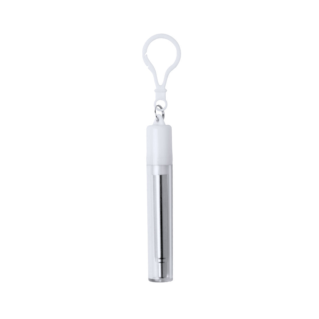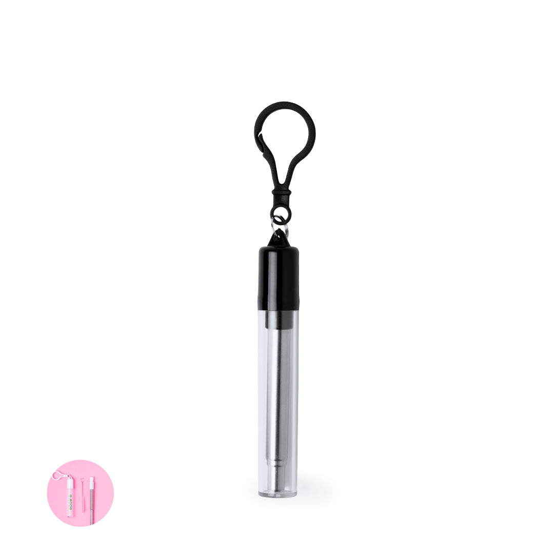 Pajita reutilizable y extensible en acero inoxidable, con boquilla de silicona. Con accesorio limpiador incluido y presentada en estuche transparente con accesorio para transporte.