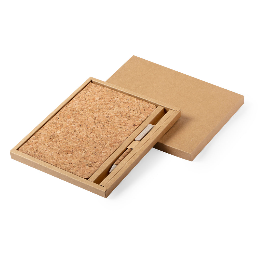 Set de bloc de notas y bolígrafo en línea nature. Incluye bloc de notas con tapas rígidas en corcho natural, con 80 hojas lisas. Bolígrafo de mecanismo pulsador, con cuerpo en corcho natural y accesorios en caña de trigo, para así fomentar la utilización de materias primas naturales y reducir las emisiones contaminantes. Presentado en estuche de cartón troquelado y diseño eco. Tinta negra.