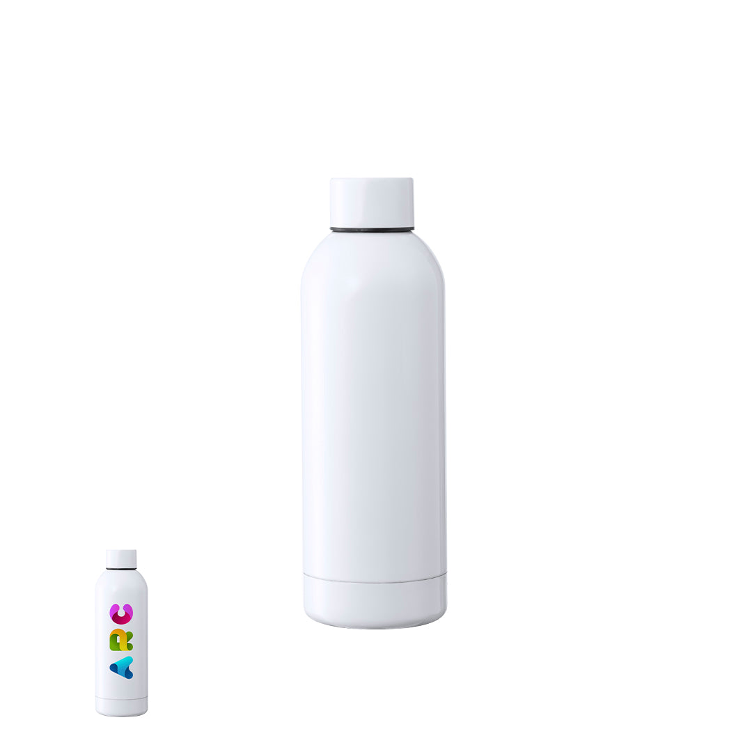 Bidón térmico de 500 ml de capacidad, fabricado en acero inox de doble pared y especialmente diseñado para marcaje en sublimación. De acabado blanco brillo y con tapón a rosca a juego, libre de BPA. Presentado en caja individual de diseño kraft. Disponible manual de instrucciones en español e inglés.