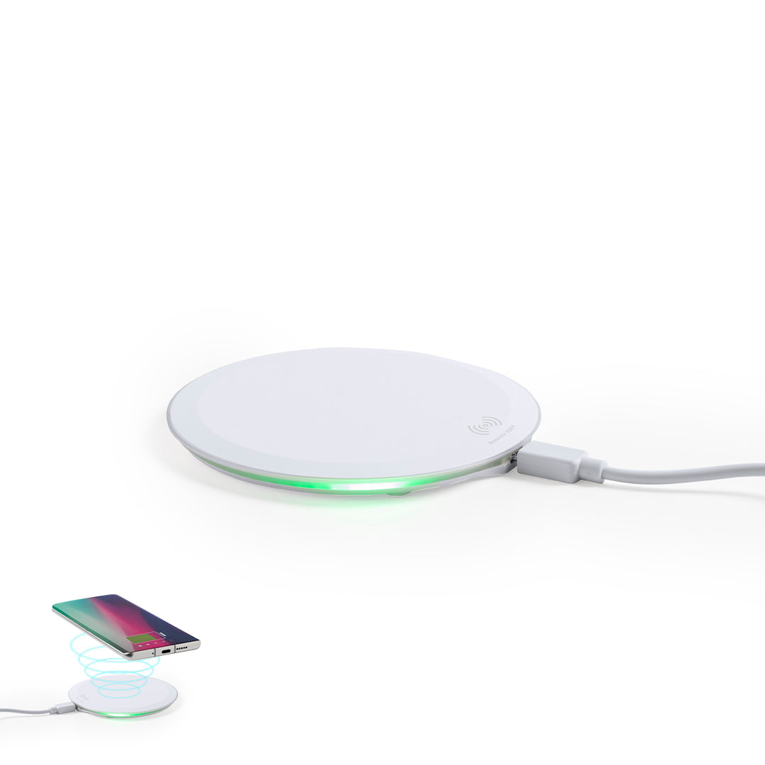 Cargador inalámbrico circular, con función carga rápida de 10W. Base antideslizante e indicador LED de estado de carga. Cable micro USB incluido y compatible con smartphones con tecnología de carga inalámbrica. Presentado en atractiva caja de diseño.