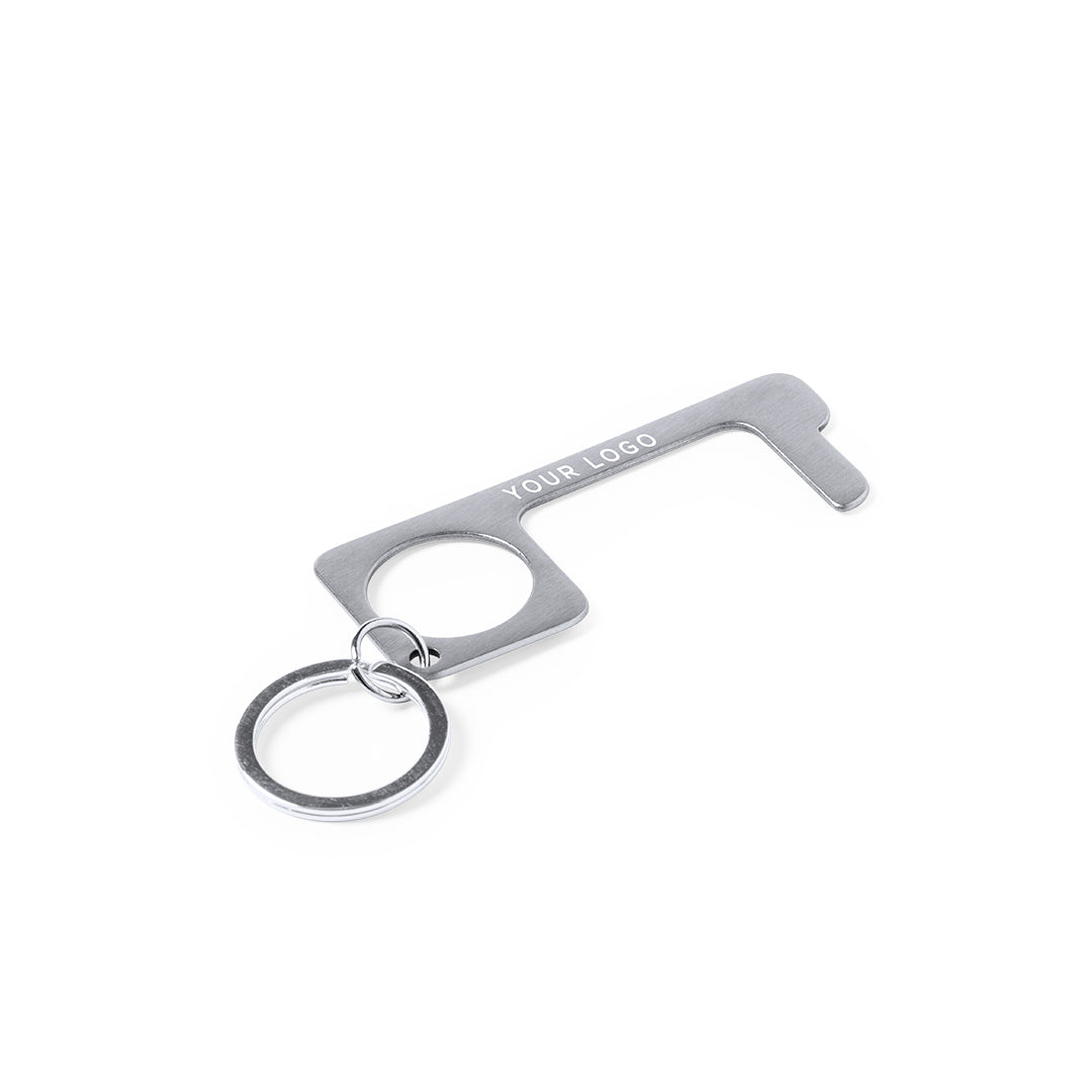 Llavero higiénico anti-contacto, fabricado en resistente acero inox. Especialmente diseñado para evitar tocar con las manos superficies de uso común (picaportes de puertas, interruptores, grifos de uso público, cajeros automáticos...). Con cómodo troquel para el dedo y presentado en bolsita individual. Recomendado para marcaje en láser.