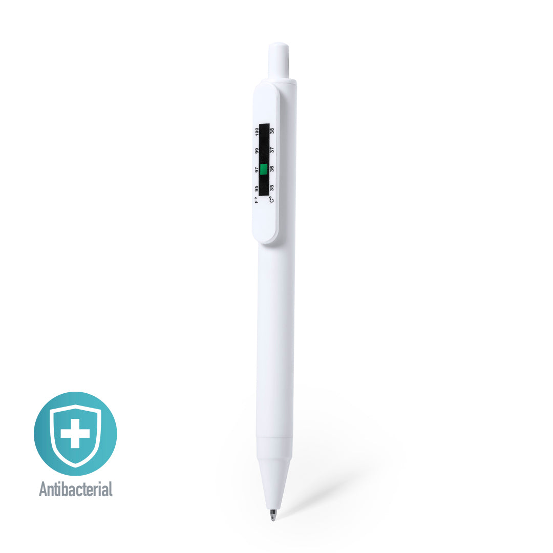 Bolígrafo antibacteriano de mecanismo pulsador con termómetro integrado en clip. Diseño monocromático, especialmente diseñado para marcaje en tampografía. En tinta azul y presentado en bolsa individual de diseño.Los productos con tratamientos antibacterianos son capaces de reducir drásticamente las cargas bacterianas presentes en las superficies de los materiales, gracias a la incorporación de agentes microbianos permanentes estáticos, con alta efectividad para inhibir y prevenir la contaminación bacteriana.Artículo de acuerdo al estándar ISO 22196, que determina la actividad antibacteriana en materiales plásticos y superficies no porosas, lo que permite conocer la efectividad de inhibición microbiana que tienen los aditivos sobre los objetos tratados mediante una evaluación cuantitativa.