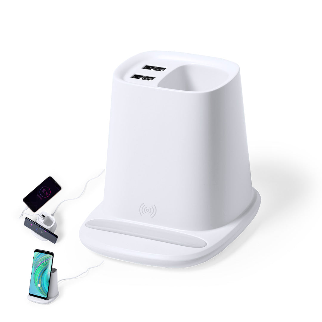 Lapicero multifunción 4 en 1, fabricado en resistente material ABS de color blanco. Con funciones lapicero, soporte para smartphone, cargador inalámbrico 5W y 2 salidas USB de 2.000 mA. Puerto USB inferior, apto para transferencia de datos. Compatible con smartphones con tecnología de carga inalámbrica. Incluye cable tipo C de 1 metro de largo y viene presentado en atractiva caja de diseño. Disponible manual de instrucciones en español e inglés.