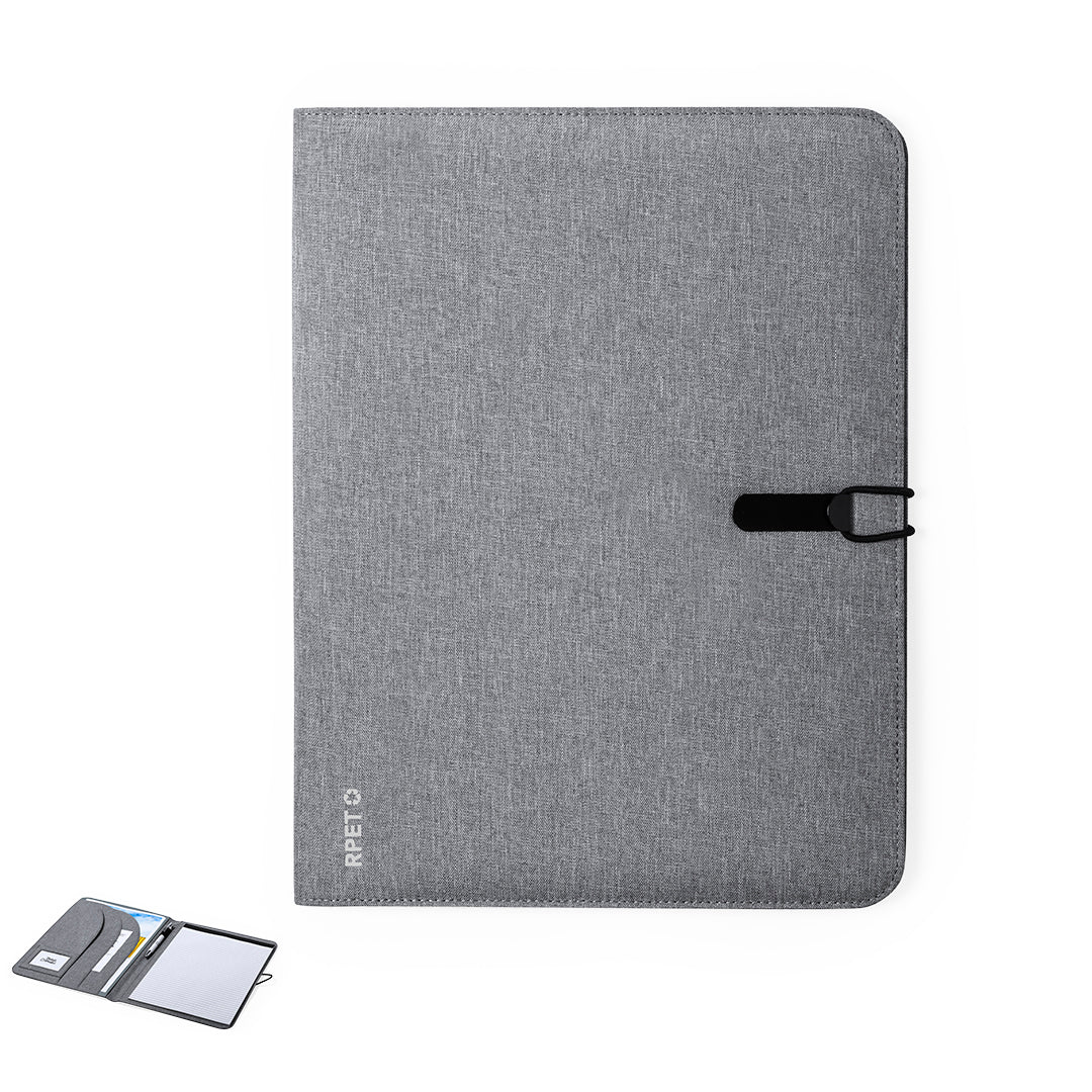 Elegante carpeta de línea nature tamaño A4. Fabricada en resistente 600D RPET efecto melange, elaborado a partir de plástico reciclado para así fomentar la reutilización de residuos plásticos y contribuir a la sostenibilidad del planeta. Detalles en negro y cierre metálico con cinta elástica especialmente diseñado para marcaje en láser. Interior con bloc extraíble de 20 hojas con disposición a una raya, 3 bolsillos de solapa, tarjeteros y soporte para bolígrafo. Distintivo RPET en esquina.