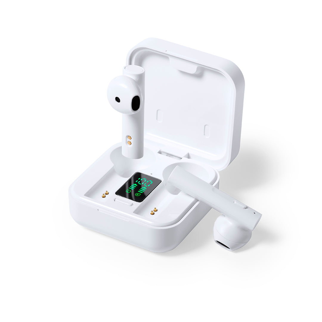 Auriculares intraurales en elegante acabado blanco y conexión Bluetooth 5.0. Con panel de carga solar integrado en la tapa y pantalla LCD interior con indicador de estado de carga. De diseño ergonómico, incluyen botón de control integrado en el auricular, con base a juego. Función manos libres y recargables con energía solar o mediante cable micro USB -incluido-. Presentados en estuche individual premium con apertura de bisagra y en atractiva caja de diseño, con manual de instrucciones en español e inglés.