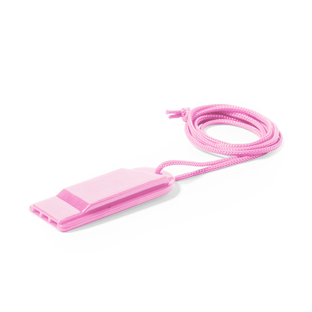 Silbato de original diseño y fabricado en resistente PS. Con cinta para el cuello a juego y disponible en extensa gama de colores.