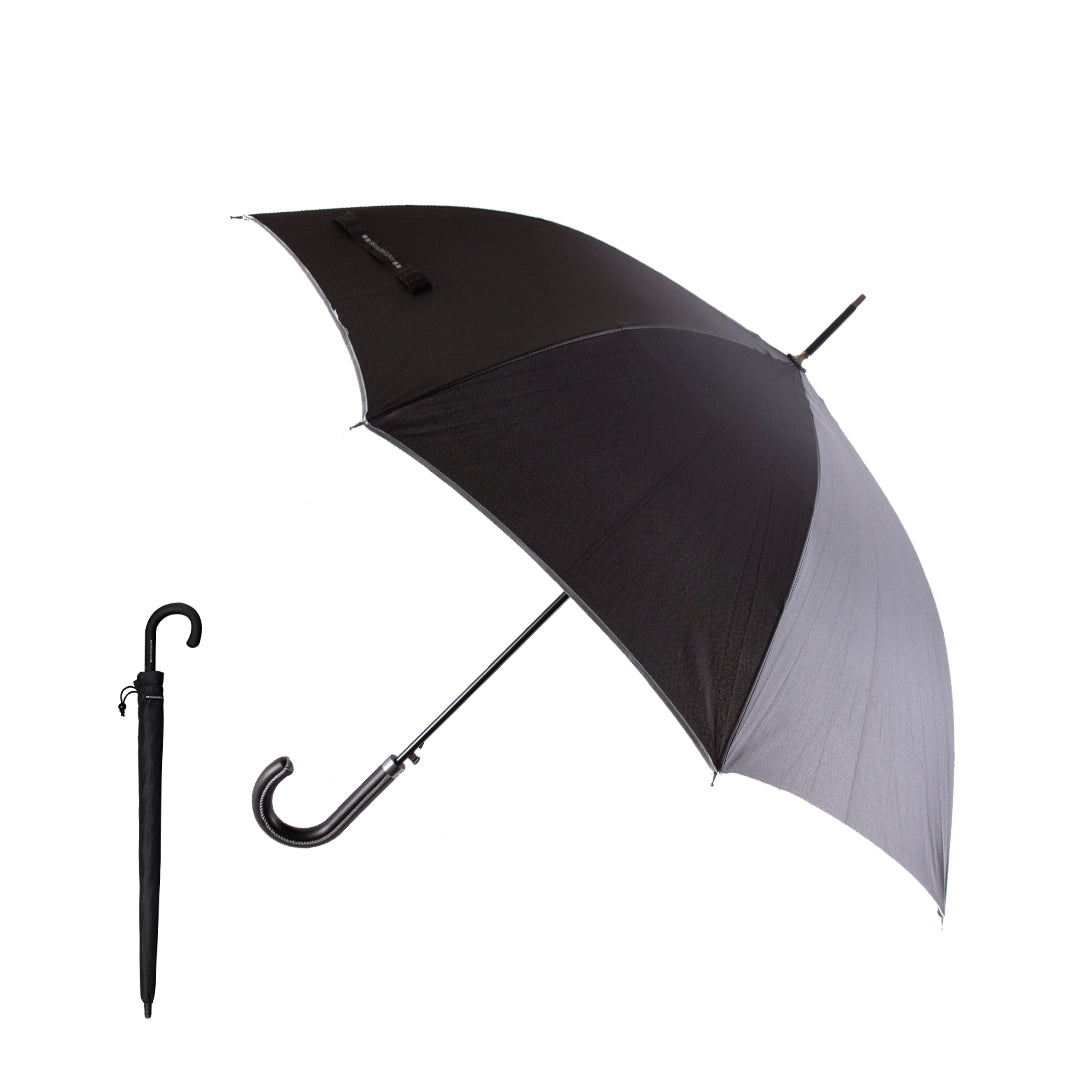 Paraguas de Antonio Miró de 8 paneles, con elegante diseño en color negro. De 120cm de diámetro, con apertura automática, sistema antiviento y en resistente material pongee. Con varillas metálicas en color negro, cierre de velcro y mango de suave tacto. Presentado en funda con logotipo de la marca y cinta con accesorio de ajuste.
