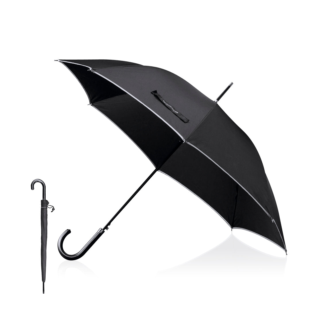 Paraguas de Antonio Miró de 8 paneles, con elegante diseño en color negro con ribetes en color blanco. De 100cm de diámetro, con apertura automática y en resistente material pongee. Con varillas metálicas en color negro, cierre de velcro y mango de suave tacto en polipiel. Presentado en funda con logotipo de la marca y cinta con accesorio de ajuste.