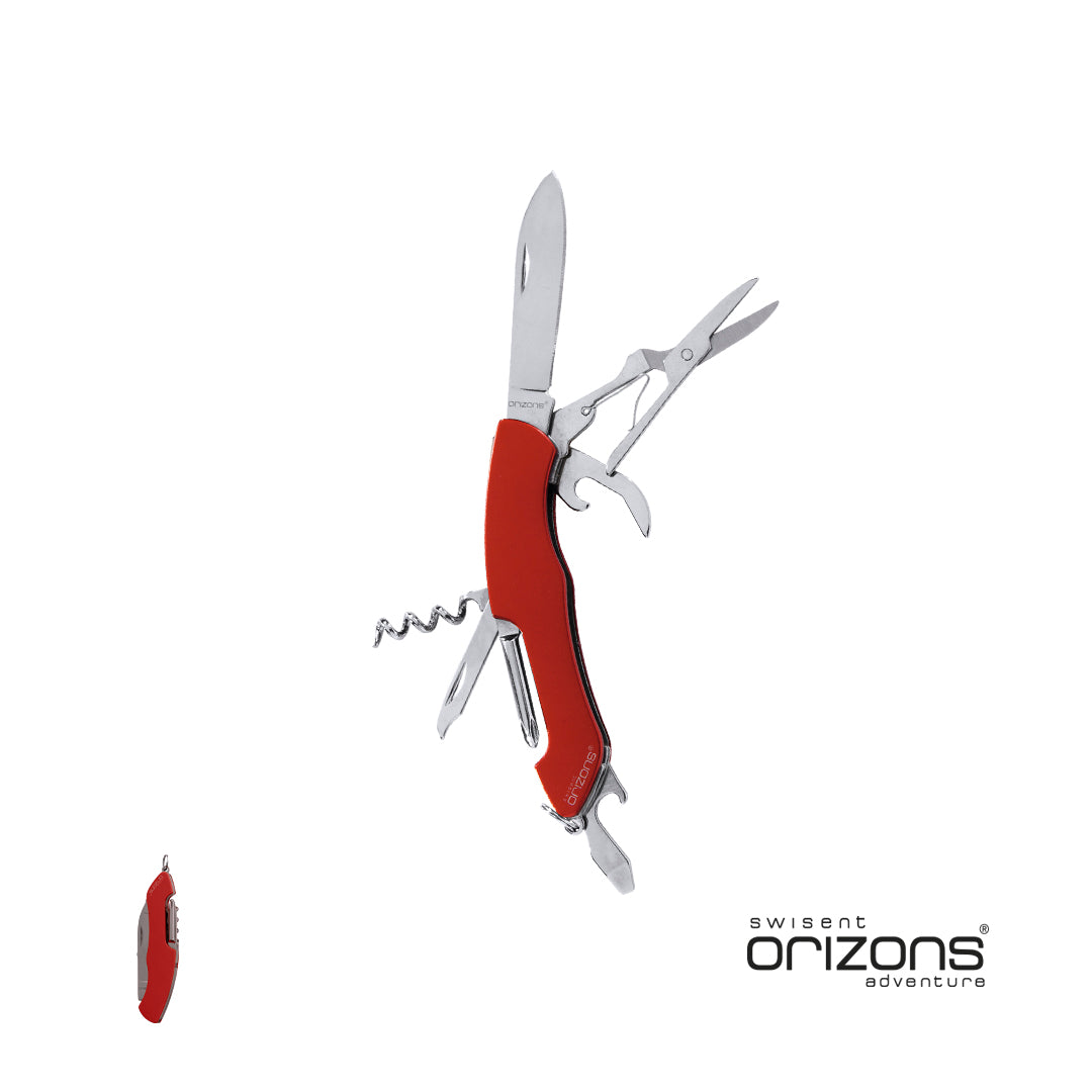 Navaja multiusos de orizons con accesorios de acero inox de 10 funciones y mango de aluminio en vivos colores. Con navaja, tijeras, abrelatas, abrebotellas con destornillador plano, destornillador de punta de estrella, punzón con lima y sacacorchos. Con anilla para llavero y presentada en atractiva caja de diseño con logotipo de la marca.