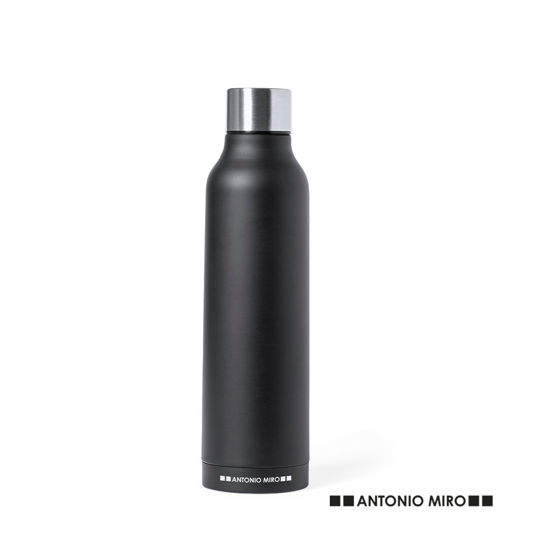 Termo en acero inox de Antonio Miró. De 500ml de capacidad y con doble pared para mejor y más duradera conservación de la temperatura. De sobrio acabado en negro satinado, logotipo de la marca en la base y con tapón cromado a rosca. Presentado en atractiva caja de diseño con logotipo de la marca.