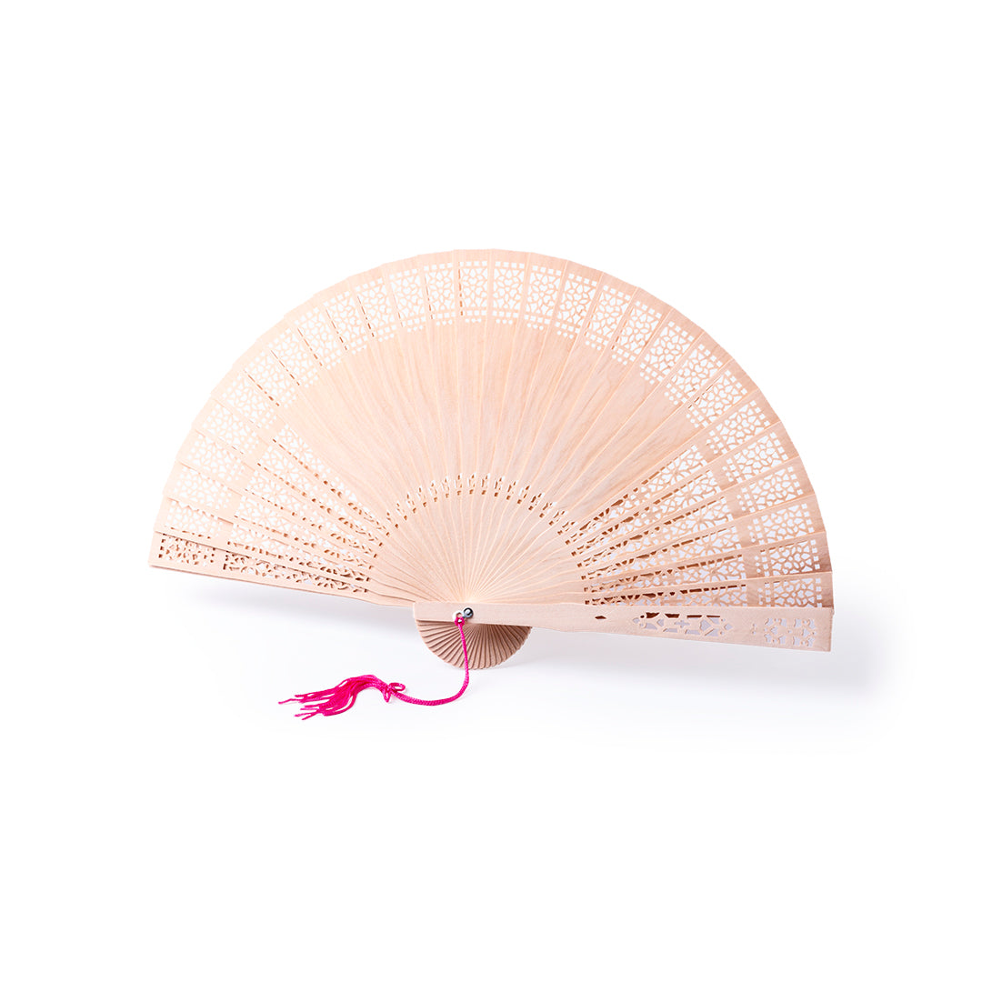 Abanico de varillas de madera natural troquelada. Con cinta pompom de transporte y presentado en caja individual.