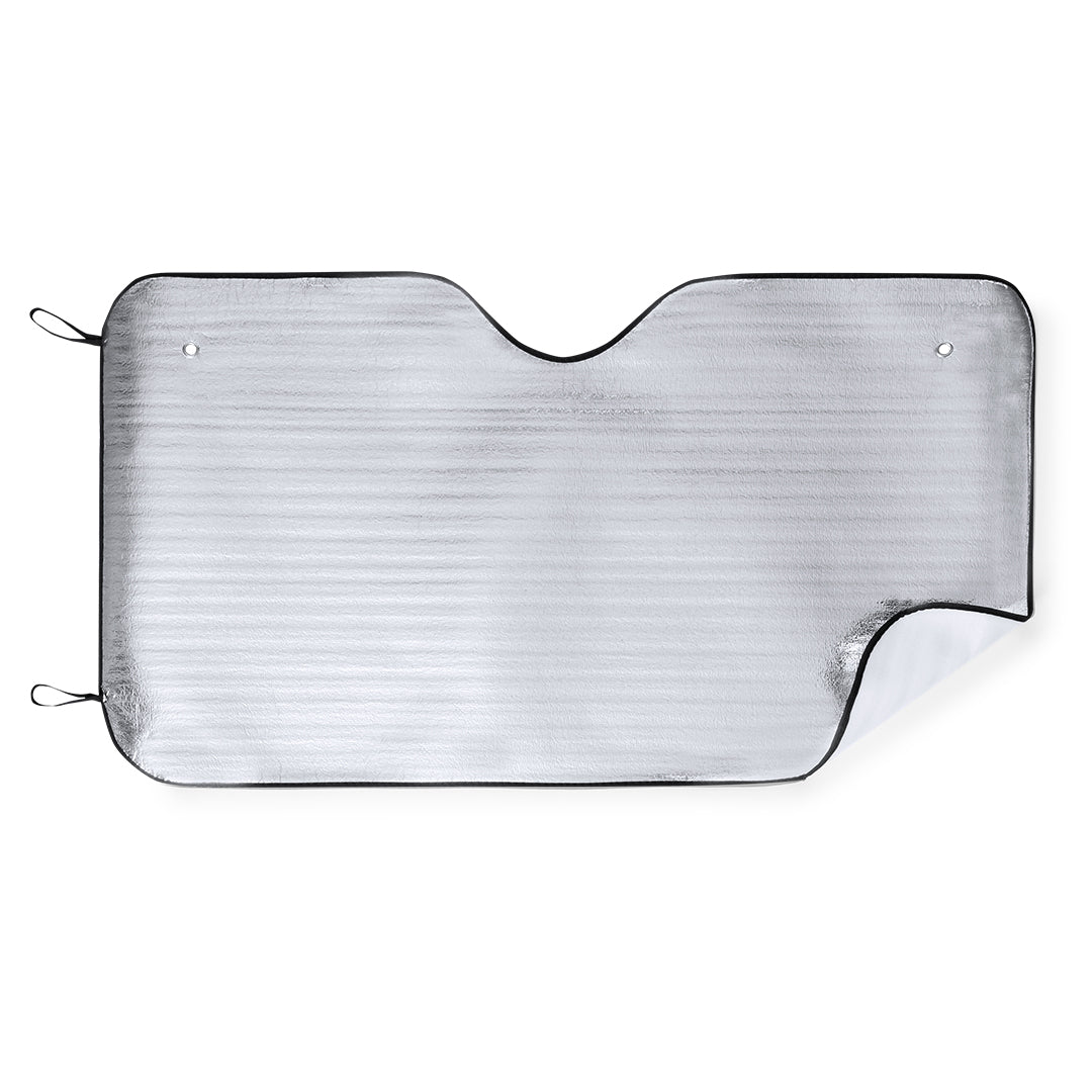 Parasol en aluminio a una cara en color plateado de acabado metalizado con ribetes de poliéster en color negro. De tamaño 130x70cm y espuma en el reverso. Cintas elásticas de plegado con argollas metálicas de refuerzo, dos ventosas para ajuste en luna y presentación desplegado en plancha para fácil impresión.
