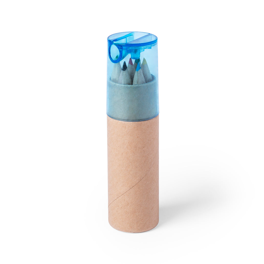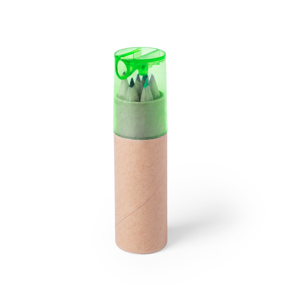 Set de 7 piezas en estuche con cuerpo en cartón natural y capucha transparente en variados colores. Incluye 6 lápices de madera con cuerpo hexagonal de acabado natural y sacapuntas integrado en tapadera.