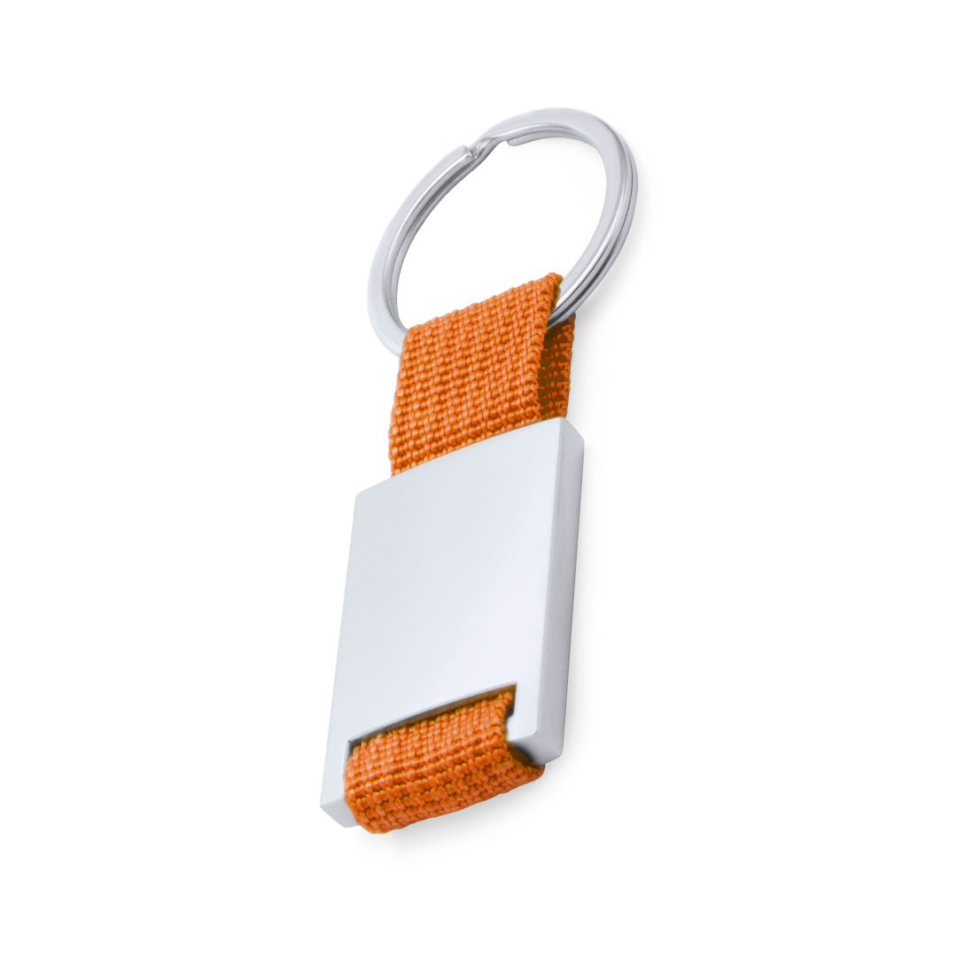 Llavero de divertido diseño con cinta de poliéster de variados y vivos colores. Con cuerpo metálico especialmente diseñado para marcaje en láser.