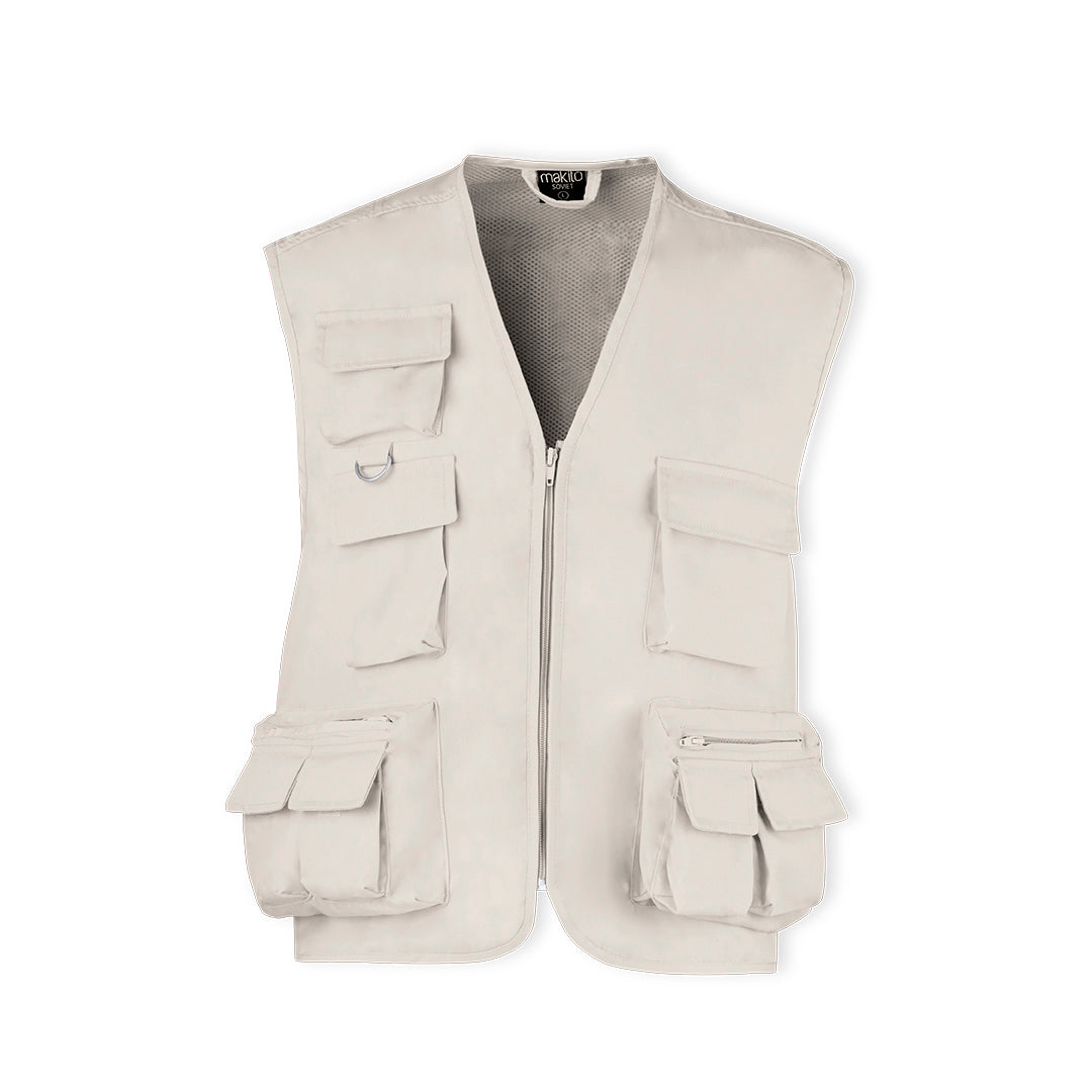 Chaleco en resistente combinación de materiales algodón y poliéster de vivos colores. Cierre de cremallera principal, multitud de bolsillos frontales y laterales de gran capacidad con cierre de velcro y anilla metálica en el pecho. Disponible en tallas L, XL, XXL.